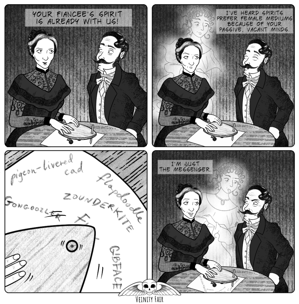 As for Miss Tique’s rude guest, it was actually a belief at the time that women made better mediums because they were passive and their minds were ‘vacant,’ thus they could be more easily possessed by spirits. This sexist belief was however embraced and used by female spiritualists in surprising ways, which we’ll explore in future episodes.