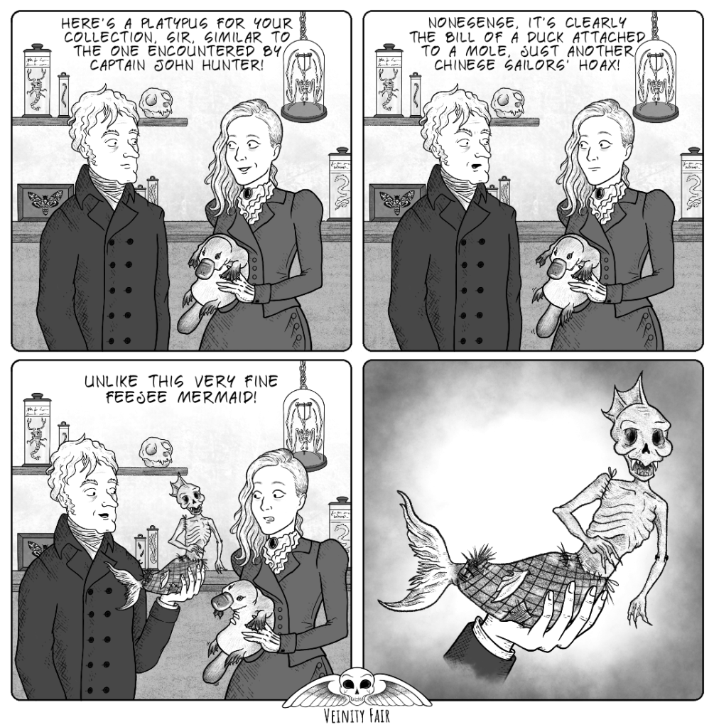 The platypus was a real mystery to the first Europeans who encountered this graceful creature, some even doubted its existence! When Captain John Hunter sent a pelt of the animal to the naturalist George Shaw in 1799, the scientific community was baffled. Shaw named the animal Platypus anatinus, a flatfoot duck, but also expressed his doubts about the authenticity of the bizarre creature, saying that “there might have been practised some arts of deception in its structure.” Other naturalists were equally suspicious that the beast was just a hoax. This was linked to the popularity of fake specimens, such as Feejee mermaids, shown at sideshows.