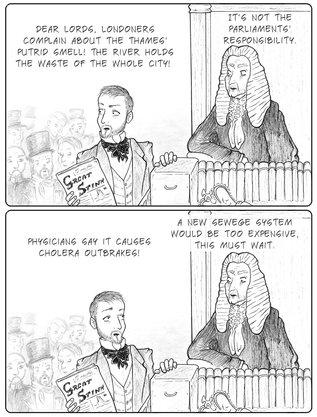 The source of this unbelievable stink was the Thames, which served as a sewer for all human, factory, and slaughterhouse waste in the area. As the London population doubled in the first half of the 19th century, so did the problems surrounding the river that served as the main source of “fresh” water. Apart from the offensive smells, Thames was also the source of cholera outbreaks and other diseases. The situation was dire and many people, including journalists and scientists, urged the government to take appropriate action even before the events of 1858.