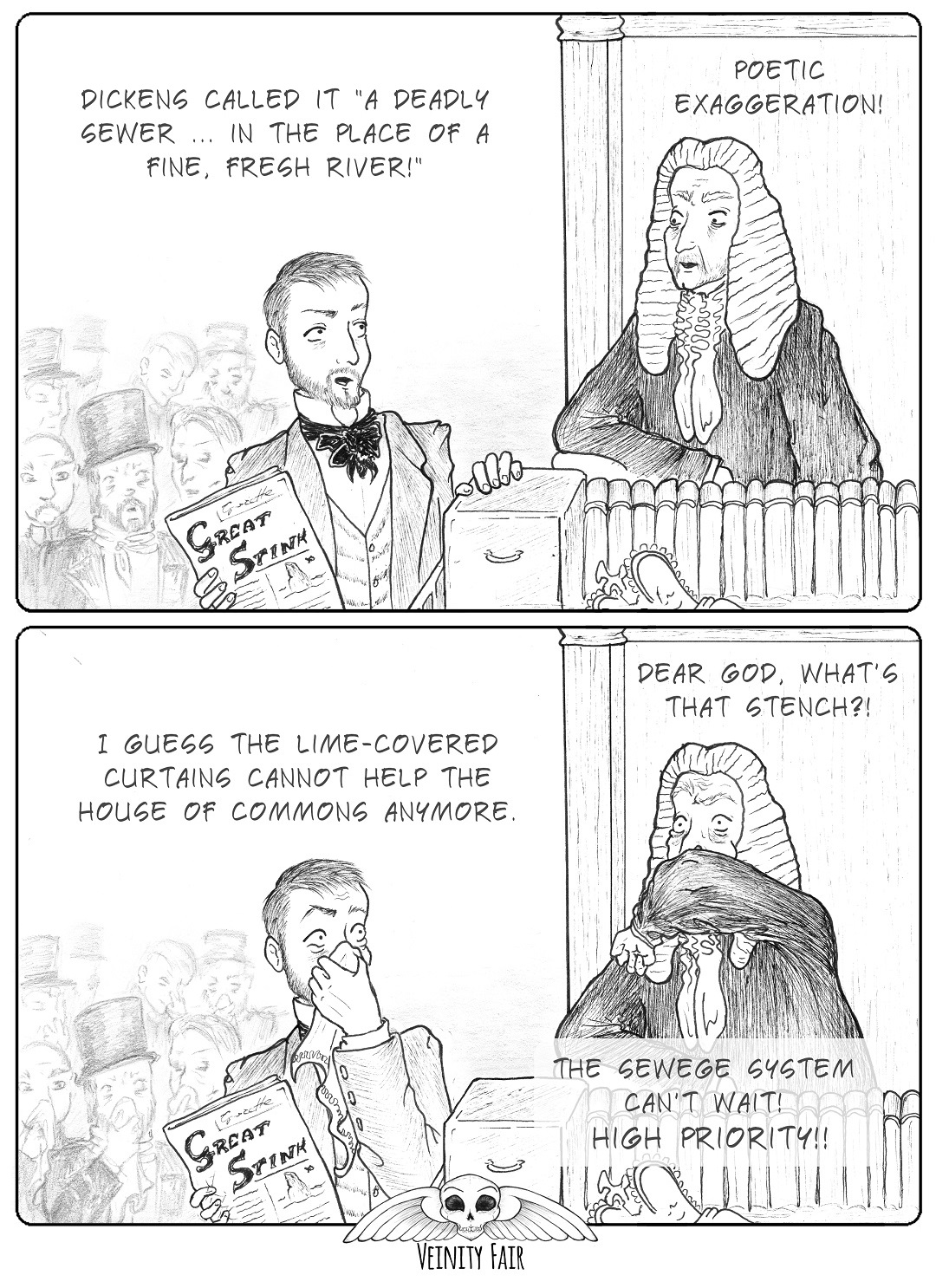 In 1848 the Metropolitan Commission of Sewers was supposed to deal with the problem. A prominent engineer called Joseph Bazalgette created plans for a new sewerage system which was estimated to cost £5.4 million. These plans weren’t accepted by the government, which even suggested that cleaning up the river wasn’t really their problem, even though they had to use scented handkerchiefs, tobacco, and curtains covered with chloride of lime to protect themselves from the putrid smells in the Palace of Westminster. 💩